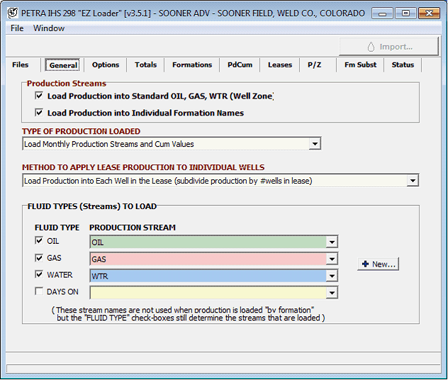 These boxes set which fluid types are loaded, and how they are named. Note that Petra automatically creates streams named OIL, GAS, WTR. For a different production stream names, select the button, and create a new monthly production definition