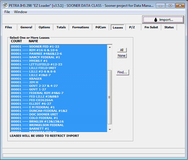 The Leases tab displays the available leases in the 298 file. Here, select the lease names you want to load. If nothing appears here make sure to select the Scan File button on the Files tab.