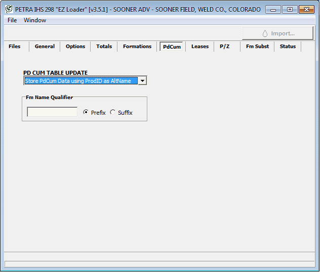 Stores cumulative values by formation name FMNAME for individual leases/wells. The ProdId is stored into the ALTNAME column and the formation name will be stored into the FMNAME column under the ProdCum tab. Each lease will have an entry regardless of formation name.