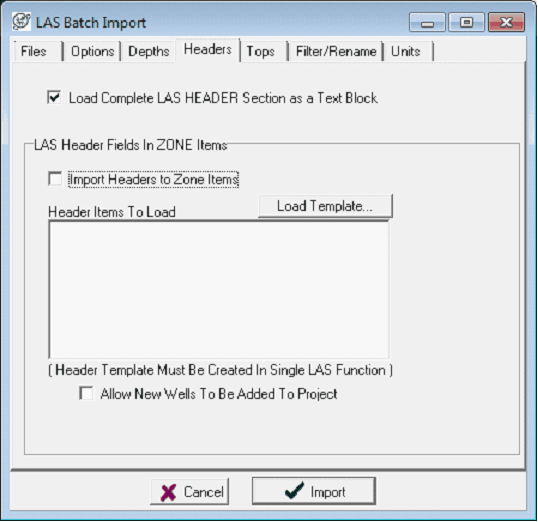 The Import Headers tab imports header information into the project zone data items.