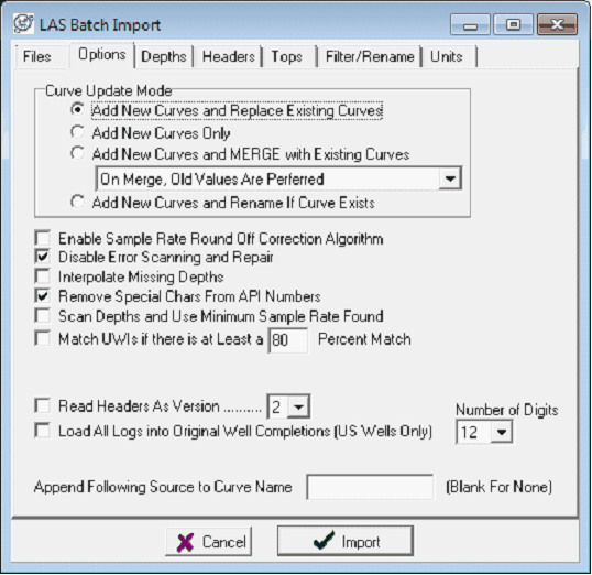 The Options tab controls how Petra handles overlaps between curves already in the database and the selected LAS file. This tab also enables a few options for loading non-standard or oddly-formatted LAS files.