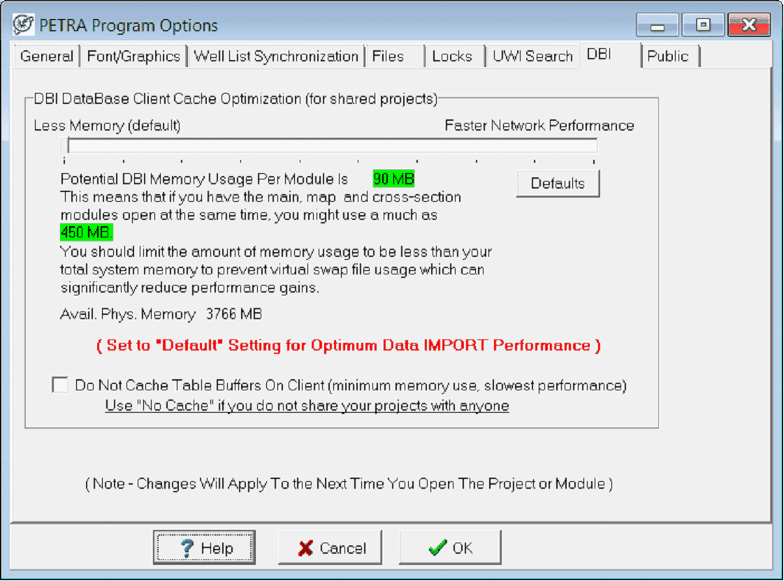 This option sets the the amount of memory used by the DBI database engine for local (client-side) caching. The default value (minimum setting) is usually sufficient. Be careful not to exceed your systems memory capabilities. Over commitment of memory to the database cache could result in extensive user of the system virtual memory, ie, swap file or create "out-of-memory" errors during data import.
