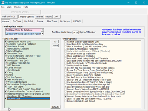Sets the location of directional surveys from the 297 file. By default, Petra can load the directional surveys into Actual or Planned, though you can change the survey definitions with the Survey Def Maintenance button.