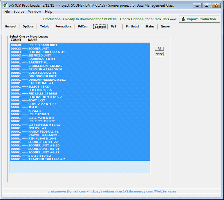 The Leases tab displays the available leases in the database file. Here, select the lease names you want to load.