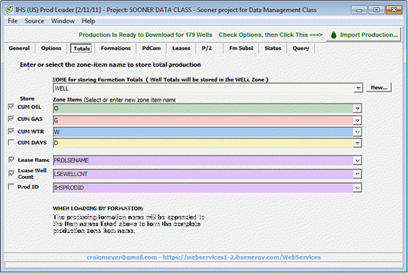 The Totals tab stores information from the production data to zone data items. Each data item is a fluid type prefix and the formation name. As an example, the Oil from the Dakota D is stored as O_602DKOTD by default.