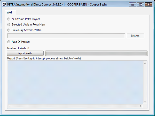 After selecting the wells, the International Direct Connect tool will display the number of selected wells. Selecting the Import Wells button will import the wells directly into the project. The Direct Connect tool imports wells in blocks of 100 wells. |