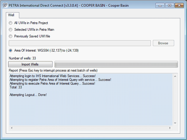 Once entered, selecting OK returns you to the Direct Connect tool. Petra will logon to IHSs International Web services to count the number of wells inside the area. In the example below, 33 wells are inside the area.