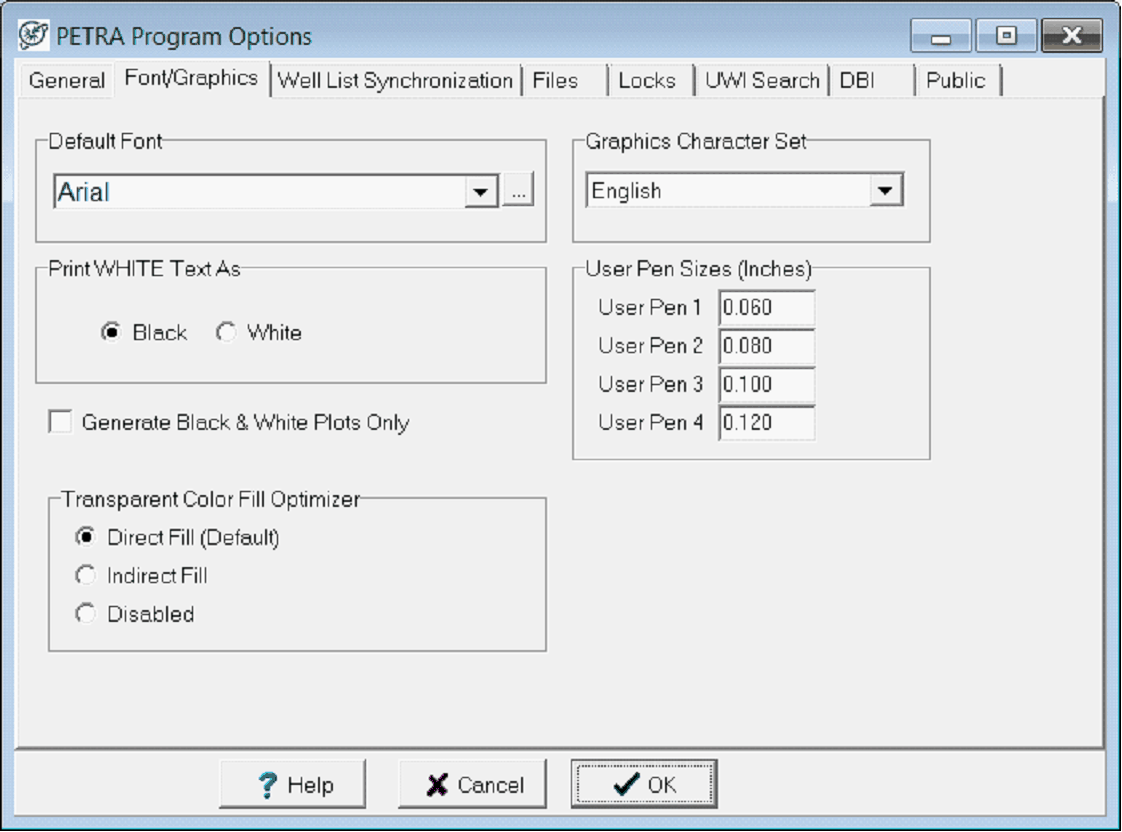This option controls how transparent color fill on top of raster log images is handled by plotter drivers. Some plotter drivers cannot transparent fill directly, so Petra has alternative methods to generate the fill. The "Direct Fill" method should be used whenever possible. If problems arise in cross-section raster log pay intervals or tops shading, first try the "Indirect Fill" method, and if that does not work, use the "Disabled" method. When the optimizer is disabled, plot files will become significantly larger.