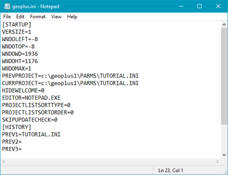 Geoplus.ini stores user-specific data like window sizes, and the previous projects opened. For standalone installations, this file will be in the installation directory. For client\server installations, geoplus.INI will be in the client directory.