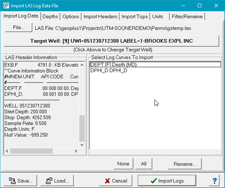 The Import File tab shows the LAS header information and the available log curves in the LAS file. Select the curves you want in the project on the Select Curves To Import List on the right side of the screen. You import any curve as a different name by double-clicking the curve name.
