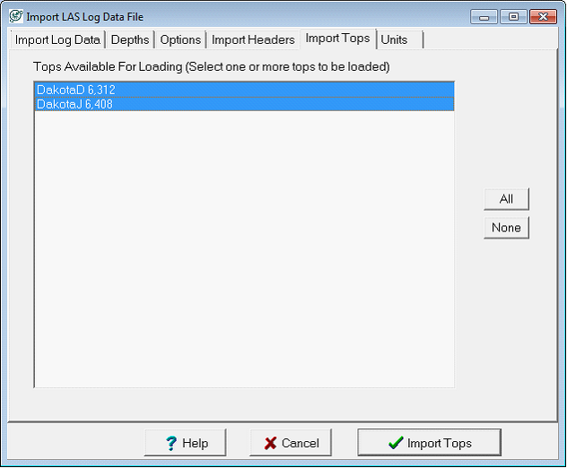 Some LAS files contain formation tops. The Import Tops tab selects which tops are brought into the project.