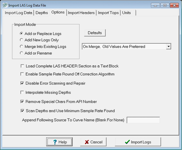 These options control how Petra handles overlaps between curves already in the project database and the LAS file. The Add or Replace option allows for the creation of new logs and will completely replace any overlapping curves in the database with the LAS file data. Add New Logs Only only creates new logs; when there is an overlap between the database and the LAS file, the database won't change. Merge into Existing Logs does not create any new curves in the database, and will merge data from the LAS file with the curves already in the database. This merge operation can either prefer old values, non-null new values, or all new values. Add or Rename allows for the creation of new logs, and will rename overlapping curve names with a numerical suffix (like GR_1). For this example, select Add or Replace Logs.