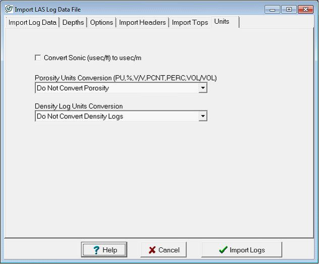 Converts density units between imperial and metric units. By default, the Do Not Convert Density Logs option is selected, which does not make any changes. The Convert KG/M3 to gm/cc converts metric density curves to use imperial units. The Convert gm/cc to KG/M3 converts imperial density curves to use metric units.