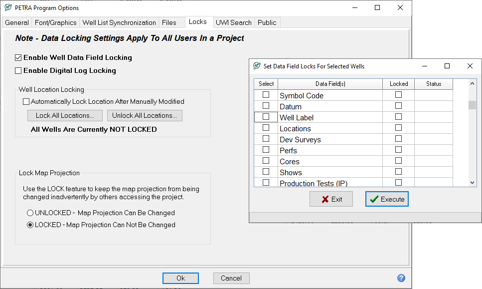 Well locations can be locked for all wells or for individual wells. Once a well's location is locked, it can not be changed, either by import or manual edit until the location is unlocked.