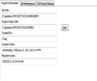 The Project Information tab displays the basics of a Petra Project on the Petra Database Server, including the database and public folder pathways, as well as the original creator and migration date