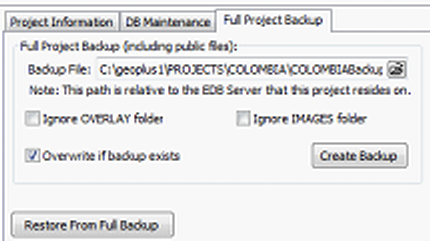 Creates a new backup of the selected project database. Backup includes the project database and database-server-stored individual user settings. This backup will not include external files (like grids and *.MAP/*.CSP settings files).
