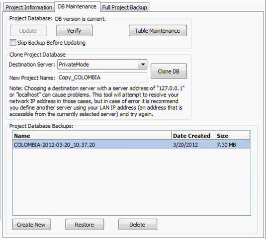The Maintenance tab performs basic project maintenance tasks, including updating, cloning, backing up project databases and project database table repairs.
