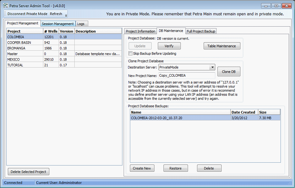 The Project Management tab displays information on the migrated Petra projects. This section handles database versions, project maintenance, and backups. The central list provides a short summary of project name, well count, project version, and descriptions. This list will always include a Master project that the database server uses as a template for Petra project tables. The far right column provides more detailed project information or maintenance options.