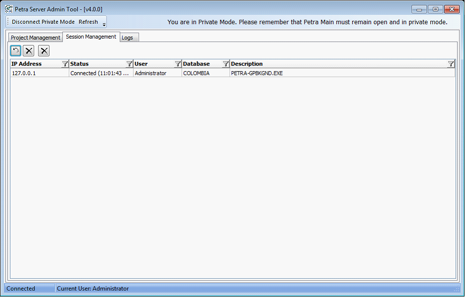 A session is an active connection to the database server. The Petra Session Management tab lists and terminates active sessions on selected database servers. In addition to a background session for every user, each open module has its own session. As an example, a user working with the Map Module, the Main Module, and the Cross-Section Module will have 4 total sessions.