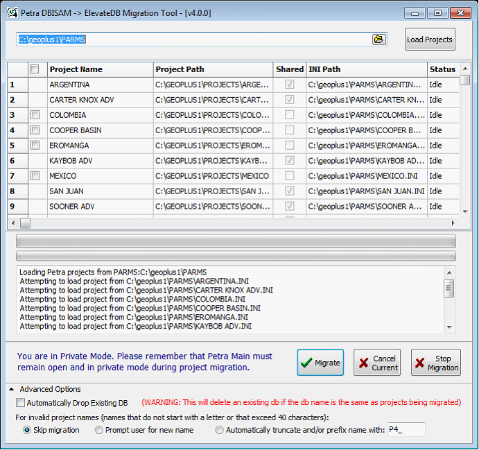 The Migration tool displays a list of projects from the Petra 3.X installation?s ?Parms? directory. This list displays the available projects by name, project path, INI path, shared status, and status. Private Mode users launch the Project Migration Tool from within Petra. When running Petra in Private Mode for the first time, the program checks for locally stored non-shared projects, and prompts you to open the Migration Tool. To open the Migration tool in private Mode: