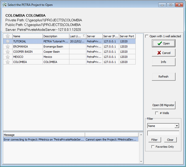 The "Select the Petra Project to Open" window lists all available private mode projects. Projects are listed in sortable columns by name, description, last used, server name, server IP, and server port. There is also a "Favorites" column to mark projects you frequently open. If the list is long you can use the Filter tool to reduce the number of listed projects.