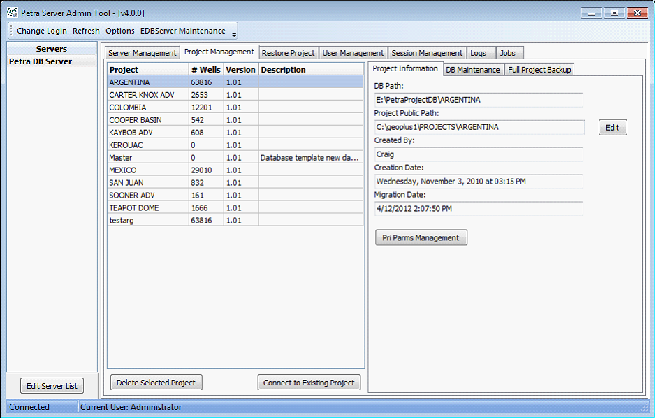 The Project Management tab displays information on the selected Petra database server's projects. Importantly, this section also handles database versions, project maintenance, and backups. The central list provides a short summary of project name, well count, project version, and descriptions. This list will always include a Master project that the database server uses as a template for Petra project tables. The far right column provides more detailed project information or maintenance options.