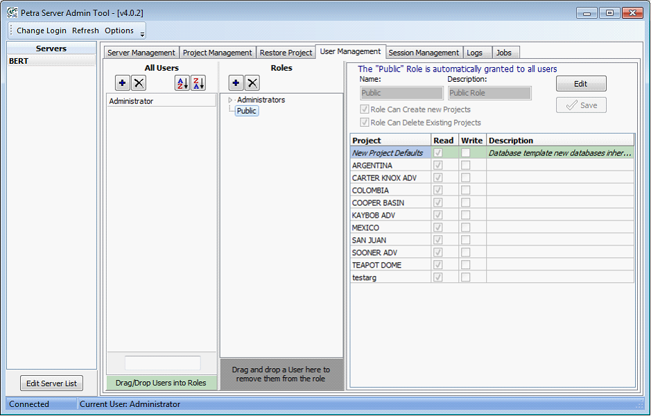 New users are automatically put into the Public role. Editing the Public role changes the default permissions for all users. Changing the New Project Defaults in the Public role changes the default read and write permissions for new projects. Users can't be dropped from the Public role. To restrict users creating and deleting projects, remove that functionality from the Public role and create another dedicated role with the create new projects/delete existing projects options enabled.