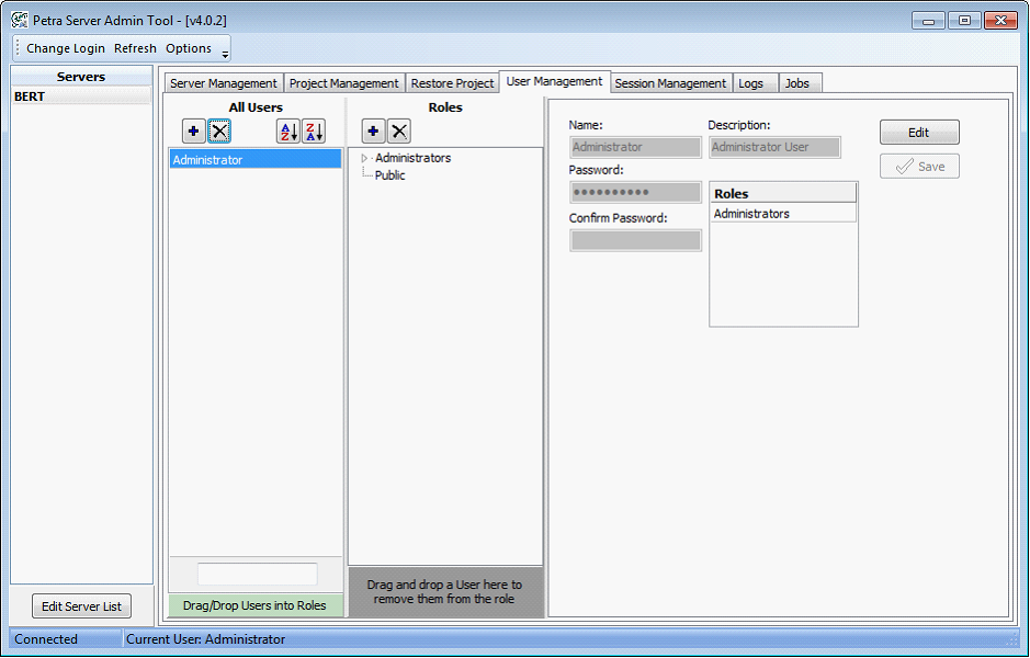 Petra Workgroup distinguishes between different users to deliver personal parameters (such as map settings) and to restrict permissions with roles. Petra defines a role as a set of permissions to read and write to individual projects, as well as the ability to create new projects from scratch. Only users in the Administrators role can edit users and roles. Petra's Database Server can use an Active Directory network to create users and dynamically maintain roles. All users listThe users list creates, modifies, and removes new users from the Petra database server. Selecting a specific user changes the tab to reflect the detailed settings for the individual user, including the user name, description, and obscured password.