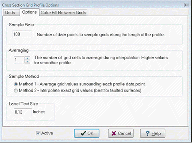The averaging factor (N = 1..10) determines the distance around each profile data point in Method 1. Larger values result in smoother profiles. All grid node values within a distance of N times the grid spacing will be averaged using an inverse distance weighting function. A value of 1 will sample only the grid nodes within a single grid cell distance. A value of 10 allows all grid nodes that are closer than 10 times the grid size to be included in the average. For Method 2, the averaging factor determines the amount of smoothing applied by a triangular filter function.