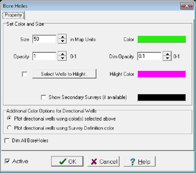 Sets the well bore diameter in map units. As an example, setting this option to "50" will create well bores with a diameter of 50 meters or feet. This is useful for illustrating borehole location (displaying them at actual diameter would make them very difficult to see), but can be misleading about the proximity of very closely spaced wells (like sidetracks).