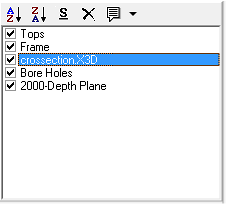 The Layers List on the left side of the screen shows the elements that have been added to 3dViz Module. This tool is a quick way to hide, modify, remove, and sort different data types. This tool also has a special list for Tops, Logs, and Seismic data. Quicklist