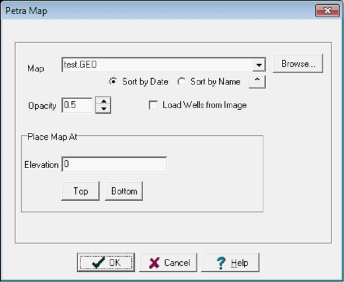 Map: File > Print To...> 3dViz ImageMap images generated by the Petra map module may be displayed at a specified elevation on the 3D display. The map images contain a well list which may be used with the image by checking the Load Wells from Image check box Adding the Map Image:To add the image file: