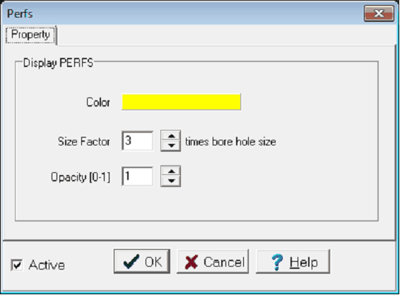 3DViz: Wells > ShowsPetra displays perfs as a cylinder around the wellbore. Petra displays all perfs the same color. To modify how shows are displayed: