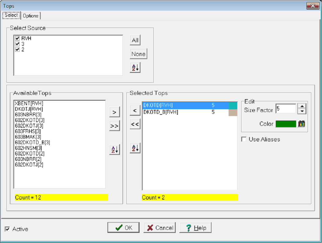 - Available Tops — This list displays the FmTops in the project with the selected source(s). To add a single top, select it on the Available Tops list, and select the ">" button. To add all the tops on the Available Tops list and select the ">>" button