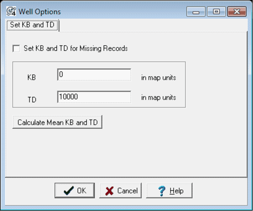 3D Viz: Wells>Set KB and TDThe 3DViz module uses a KB (or other well datum) and TD (Total Depth) to position wells inside the module. The 3DViz module cannot plot wells that do not have these values. This tool assigns a default KB and TD for wells missing these values. A Deviated well will use the deviation survey to calculate a TD.