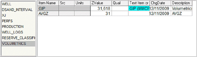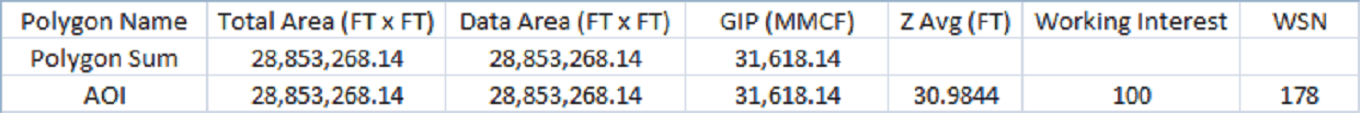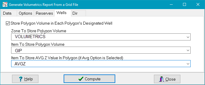 The Zone To Store Polygon Volume dropdown simply sets the zone where the relevant volumetric data will be stored. By default, volumetric data is saved in the WELL zone. In the example below, data will be stored in the VOLUMETRICS zone. The Item to Store Polygon Volume selects the specific data item where the relevant volume is stored. In the example below, data will be stored in the GIP zone The Item to Store AVG Z selects the specific pre-existing data item where the average grid thickness for each visible named polygon is stored. What this thickness actually represents depends on the type of the grid used Note that the Print Average Value for each Polygon in Report option on the Options tab needs to be selected for this option to work. In the example below, data will be stored in the GIP data item in the VOLUMETRICS zone.
