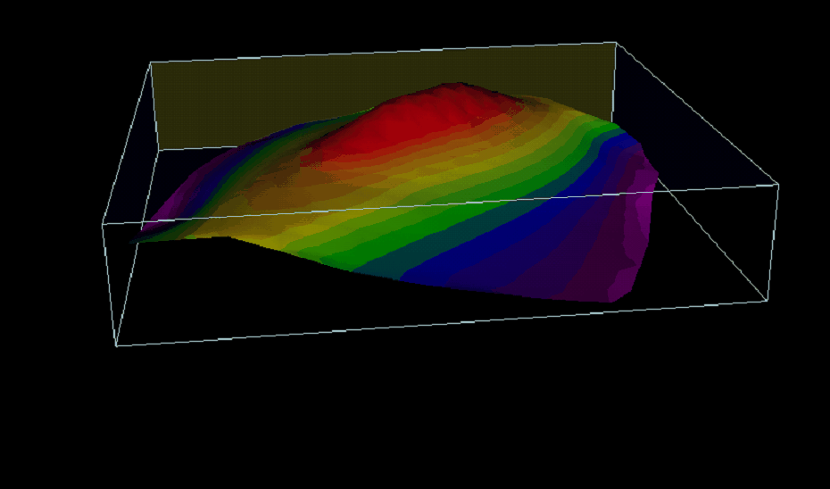 How Grid-Based Volumetrics WorksWhen Petra calculates a grid from a data set (such as pay thickness or porosity measured at each well), it creates a surface that interpolates the values across the empty spaces between data points. In the simplest case, an isopach grid of net pay thickness reflects the thickness of pay (the Z value) at every point on a map (X and Y for Lat and Long). The example below is an isopach grid projected into three-dimensional space. The volume underneath the surface of the isopach grid (down to zero feet thick) equals the volume of the reservoir. Given a good grid that accurately maps the subsurface, this method can generate much more precise measurements of the volume of a reservoir than conventional estimation.