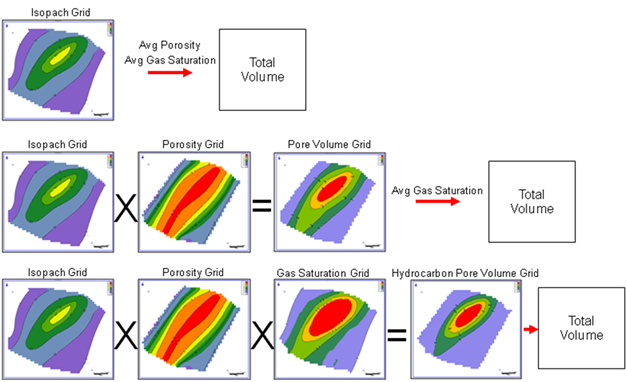 This same grid-based volumetrics can also increase accuracy in heterogeneous reservoirs. Both porosity and water saturations often vary significantly across an entire reservoir. Deterministic calculations force a single average porosity and water saturation, which can easily ignore these effects. In contrast, multiplying individually mapped grids of reservoir thickness, porosity, and hydrocarbon saturation together can generate a more accurate picture of the total volume occupied by hydrocarbons. The diagram below shows how different kinds of grids can be used to calculate volumetrics in an oil and gas context. The red arrow on each line shows when the volumetrics calculation is performed, and which assumptions are made during the calculation. The first example shows a simple isopach grid; calculating a total volume of oil or gas requires an assumed average porosity and gas saturation. The second example shows an isopach and porosity grid. Multiplying these together generates a pore volume grid, which gives the distribution of pore space footage. Calculating volumetrics here requires an average gas saturation. The final example multiplies an isopach, porosity, and gas saturation grid together to form a hydrocarbon pore volume (HPV) grid. Since this HPV grid already calculates the distribution of hydrocarbons in the system, it needs no further assumed reservoir variables.