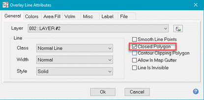 Initial Polygon SetupVolumetrics can be calculated for the grid as a whole, or only for the grid underneath active overlay polygons on the Map Module. While this is most used for assessing volumetrics in individual leases, volumetric polygons can also be used to outline a specific area of interest or to eliminate the effect of large but unproductive areas. To use polygons, select the overlay line in the map module and double-click to bring up the lines attributes. On the General tab, make sure that the line is a closed polygon.