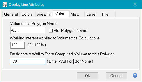 Next, select the Volm tab to edit the polygons name and working interest. The calculations made inside this polygon will be referenced by this name. While this is most used for assessing volumetrics in individual leases, volumetric polygons can also be used to outline a specific area of interest or to eliminate the effect of large but unproductive areas. In the example below, the selected polygons volumetrics name is AOI and its WI is 100%. You can also designate a specific wells WSN to store the specific polygons calculated volume. Remember that a wells WSN number is the number Petra assigns to the well when it is created in the project; it is not the API or UWI number. This volume is stored in the wells zone data, and is set up during the volumetrics process. In the example below, volumetric data for this AOI polygon will be stored in the well with a WSN of 178.
