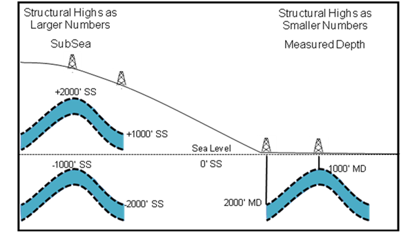 A single structure map only represents the elevations of a surface and doesn't inherently have any measurement of thickness. When using a structure map, Petra calculates thickness by using the volume of the grid between the minimum and maximum Z values set on the Data tab. In the example below, Petra will calculate a thickness between -1200 SS and -2200 SS. It is important to note that setting a limit below the bottom of the grid will add a large extra bulk to the volumetric calculation. The example below will have an additional 200 of section added to the volumetric calculation.