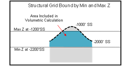 Calculating volumetrics with a structure map can also lead to problems if the thickness of the reservoir rock is thinner than the difference between the grid and the bounding lower z value. With a sufficiently thick reservoir, the bounds are completely covered by reservoir rock. With thinner reservoirs, the volumetric calculation can include a volume that doesn't actually include reservoir rock, thus overestimating the volume.