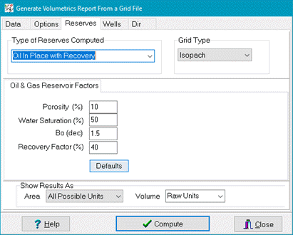 Print Average Value for each Polygon in Report - This option simply calculates the average grid thickness for each visible named polygon. What this thickness actually represents depends on the type of the grid used. The average Z value for a structure grid will be an average elevation rather than an average thickness. Apply Working Interests Associated with Overlay Polygons - This option scales each volume inside a volumetrics polygon by the working interest. Write Volumes to SHAPE FILE - This option saves currently visible volumetric polygons and data to a shape file. Select the option and navigate to the desired shape file. This copies all currently visible volumetric polygons to a single shape file. Reserves tabThe Reserves tab selects the type of reserves calculation and specifies the type of input grid. The reserves types include basic volumes, recoverable oil in place, recoverable gas in place, coal bed methane, and coal tonnage. The map type tells Petra whether the input grid is an isopach, a pore volume map, or a hydrocarbon pore volume map. The Map Type only affects oil and gas reserve calculations. The options on the Reserves tab changes depending on the selected reservoir and map type. Similarly, the area and volume dropdowns at the bottom of the window show the relevant units for the specific reserves calculation. Basic Volumes (No Scaling)The simplest form of a volumetric calculation is the first option, Basic Volumes (No Scaling). This option simply calculates the volume occupied by the grid without any additional reservoir calculations. Note that the Map Type option has no effect on this calculation. The Basic Volume calculation can display results in a variety of areas and formats. For area, the available units include raw units (as defined on the Units tab), square feet, square meters, and acreage. For volume, the available units include raw units (as defined on the Units tab), cubic feet, acre-feet, acre-meters, MBO, MMCF, and cubic meters.