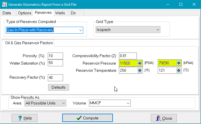 Gas in Place with RecoveryPetra's oil reserves calculations multiplies the total area of pore space occupied by hydrocarbons by a recovery factor. This volume is then divided by Bg to correct for differences in volume between hydrocarbons in the reservoir and the same hydrocarbon at surface conditions. Gas In Place: GIP = Volume*Por*(1-Sw)*Rf / Bg Where Bg = Patm/P*(460+T/460+60)*Z; Patm = 1 The three options here for Map Type (isopach, pore volume, and hydrocarbon pore volume) simply tell Petra what the selected grid represents. Practically, the map type grays irrelevant options out. An isopach grid just contains thickness and will need an average water saturation and porosity. A pore volume grid already contains the thickness and porosity information and just needs average water saturation. A hydrocarbon pore volume grids already contains all this information, and therefore needs no averaged porosity and saturation information. The recoverable gas in place calculation also requires a compressibility factor, reservoir pressure, and reservoir temperature. The calculation only uses the numbers on the imperial units side; SI units must be converted to imperial units. Using imperial units is fairly simple simply enter the reservoir pressure and temperature in PSI and °F into the boxes on the left (highlighted in yellow) To use SI units, enter in the pressure and temperature in kPAA and °C into the boxes on the right (not highlighted) and select the arrow buttons The Gas In Place with Recovery calculation can display results in a variety of areas and formats. For area, the available units include raw units (as defined on the Units tab), square feet, square meters, and acreage. For volume, the calculation is limited to MMCF.
