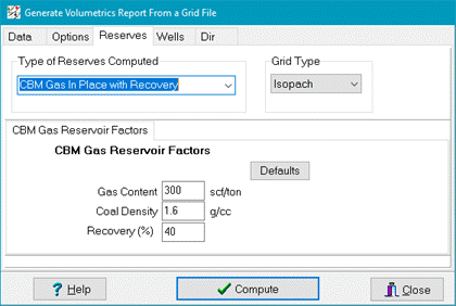 Coal Bed Methane (CBM) in Place with RecoveryThe CBM Gas in Place with Recovery option calculates reserves for a coal bed methane field. Note that the Map Type option has no effect on these calculations, and the grid is always assumed to be an isopach grid. CBM Gas In Place: CBMGIP = Volume*Cf*Gc*Sg*Rf where Cf converts bulk density in g/cc to tons/acre-ft The Coal Gas In Place with Recovery calculation displays results in a variety of areas and formats. For area, the available units include raw units (as defined on the Units tab), square feet, square meters, and acreage. For volume, the calculation is limited to MMCF.