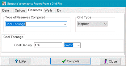 Coal TonnageCoal tonnage simply calculates the volumetrics of an isopach grid and multiplies this value by an average coal density. Coal (Tons) = Volume*CoalDensity*62.42796061/2000 when density is in gm/cc Coal (Tons) = Volume*CoalDensity/1000 when density is in kg/m3 The Coal Tonnage calculation displays results in a variety of areas and formats. For area, the available units include raw units (as defined on the Units tab), square feet, square meters, and acreage. For volume, the calculation is limited to Tons (2,000 lbs).