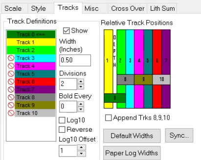 Tracks are displayed as a series of depth grid lines and one or more vertical subdivisions. Setting the width, number of grid divisions and logarithmic scale option can customize tracks. Each track grid can be visible or hidden from view.
