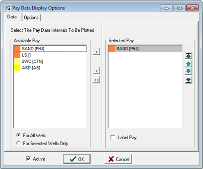 The Cross Section Module only displays the pay names on the Selected Pay list. To add a log to the Selected Pay list:Select the desired pay name on the Available Pay list and left click the ">" button. To drop a log(s) from the Selected Pay list: