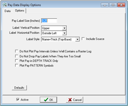 Pay > Pay Data Display OptionsThe Pay Display Options tool controls how Petra displays pay intervals on the cross section. Some of the basics of the pay names, including name, color, and display patterns, are set on the Pay Interval Data tool on the Main Module's Raster tab. To open the Pay Data Display Options tool: