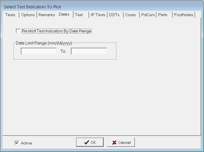 The Dates tab restricts the tests displayed on the cross section to only those falling within a date window.